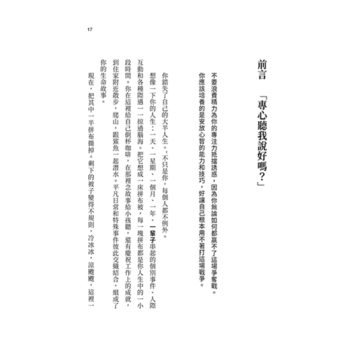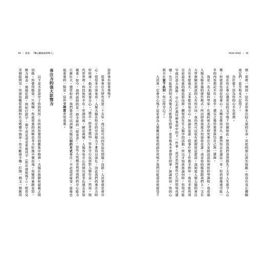 成功從我們如何使用專注力開始。在《顛峰心智》這本書中,作者將專注力科學與從事高風險工作的專業人士的動人故事結合,為讀者示範如何更能活在當下,充分發揮自己的潛能。