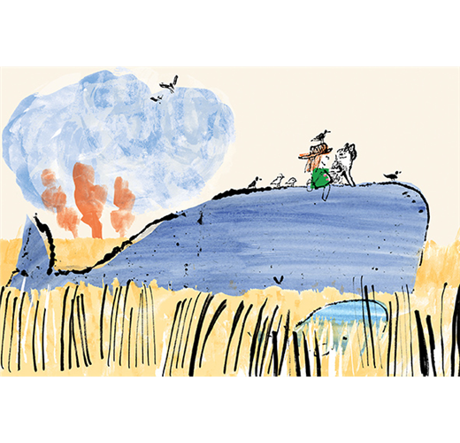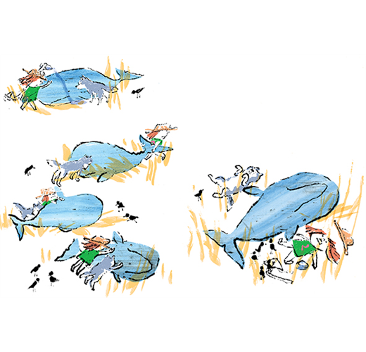 溜到陸地玩的小鯨魚,受困在草叢,小孩溜溜和小狗巧比,想辦法幫忙他回家。人類能力有限,幸好有一直在旁邊看著的群鳥來幫忙。收到訊息的鯨魚媽媽找到他們,還邀請溜溜和巧比到家裡吃點心。小鯨魚急著回家,鯨魚媽媽告訴他等風來就走。果然,風來了,草原被吹得變成一波一波的海浪,小鯨魚跟著媽媽在草浪裡游了起來,往大海的方向去。