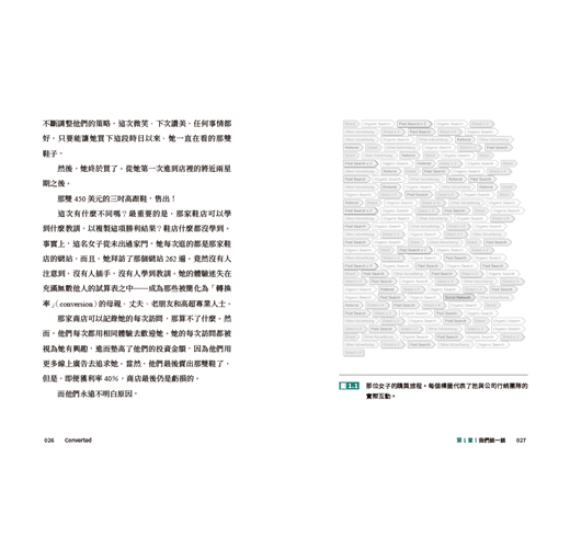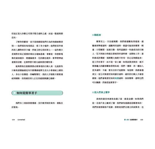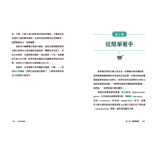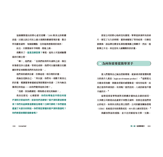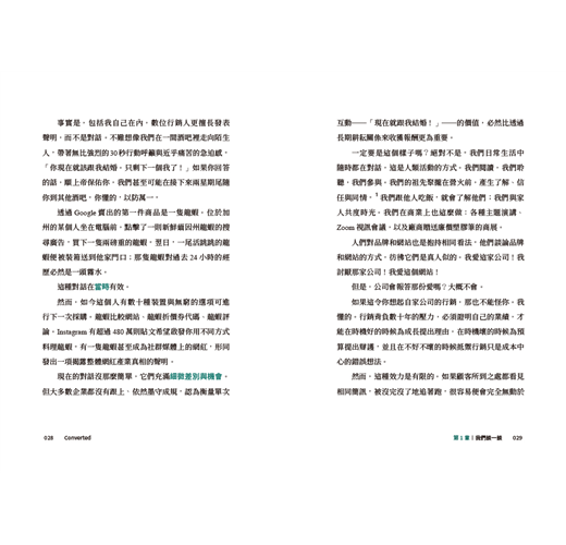 第01章 我們談一談 星期六的午後,一位女子走進一家精品鞋店,看著一雙高跟鞋。無可避免地,一名店員趨前跟她說話。「需要幫忙嗎?」那名女子不理會店員,又多看了幾眼那雙高跟鞋,然後便走出店外。 或許是鞋子的款式、昂貴的價格,或者只是穿起來勢必痛得要命;但無論她有什麼理由,她都不打算購買。還是⋯⋯她想要買? 那名女子當天稍後又回來了,上演相同的場景。打招呼、短暫的興趣、迅速退場。第三次、第四次、第五次,然後到了隔天,一樣的事情又再度發生,後天也是。店員不斷調整他們的策略,這次微笑、下次讚美,任何事情都好,只要能讓她買下這段時日以來、她一直在看的那雙鞋子。 然後,她終於買了。從她第一次進到店裡的將近兩星期之後。那雙450美元的三吋高跟鞋,售出! 這次有什麼不同嗎?最重要的是,那家鞋店可以學到什麼教訓,以複製這項勝利結果?鞋店什麼都沒學到。事實上,這名女子從未出過家門。她每次逛的都是那家鞋店的網站,而且,她拜訪了那個網站262 遍。竟然沒有人注意到,沒有人插手,沒有人學到教訓。她的體驗迷失在充滿無數他人的試算表之中─成為那些被簡化為「轉換率」(conversion)的母親、丈夫、老朋友和高超專業人士。 那家商店可以記錄她的每次訪問,那算不了什麼。然而,他們每次都用相同體驗去歡迎她。她的每次訪問都被視為她有興趣,進而墊高了他們的投資金額,因為他們用更多線上廣告去追求她。當然,他們最後賣出那雙鞋了,但是,即便獲利率40%,商店最後仍是虧損的。 而他們永遠不明白原因。 事實是,包括我自己在內,數位行銷人更擅長發表聲明,而不是對話。不難想像我們在一間酒吧裡走向陌生人,帶著無比強烈的30秒行動呼籲與近乎痛苦的急迫感。「你現在就該跟我結婚。只剩下一個我了!」如果你回答的話,願上帝保佑你,我們甚至可能在接下來兩星期尾隨你到其他酒吧。你懂的,以防萬一。 透過Google賣出的第一件商品是一隻龍蝦。位於加州的某個人坐在電腦前,點擊了一則新鮮緬因州龍蝦的搜尋廣告,買下一隻兩磅重的龍蝦。翌日,一尾活跳跳的龍蝦便被裝箱送到他家門口;那隻龍蝦對過去24小時的經歷必然是一頭霧水。 這種對話在當時有效。 然而,如今這個人有數十種裝置與無窮的選項可進行下一次採購。龍蝦比較網站、龍蝦折價券代碼、龍蝦評論。Instagram 有超過480 萬則貼文希望啟發你用不同方式料理龍蝦。有一隻龍蝦甚至成為社群媒體上的網紅,形同發出一項揭露整體網紅產業真相的聲明。 現在的對話沒那麼簡單,它們充滿細微差別與機會。但大多數企業都沒有跟上、依然墨守成規,認為衡量單次互動─「現在就跟我結婚!」─的價值,必然比透過長期耕耘關係來收獲報酬更為重要。 一定要是這個樣子嗎?絕對不是。我們日常生活中隨時都在對話,這是人類活動的方式。我們閱讀,我們聆聽,我們參與。我們的祖先聚攏在營火前,產生了解、信任與同情。我們跟他人吃飯,就會了解他們;我們與家人共度時光。我們在商業上也這麼做:各種主題演講、 Zoom 視訊會議,以及廠商贈送廉價塑膠筆的商展。 人們對品牌和網站也是抱持相同看法。他們談論品牌和網站的方式,彷彿它們是真人似的。我愛這家公司!我討厭那家公司!我愛這個網站! 但是,公司會報答那份愛嗎?大概不會。 如果這令你想起自家公司的行銷,那也不能怪你。我懂的。行銷背負數十年的壓力,必須證明自己的業績,才能在時機好的時候為成長提出理由,在時機壞的時候為預算提出辯護,並且在不好不壞的時候抵禦行銷只是成本中心的錯誤想法。 然而,這種效力是有限的。如果顧客所到之處都看見相同簡訊,被沒完沒了地追著跑,很容易便會完全無動於衷。不過,行銷人員已開始看出對話的價值,不僅是因為其提供大量的顧客資訊,也是因為他們能因此甩開競爭。他們脫穎而出,他們獲勝。 這使得大幅轉變已是無可避免。最佳企業與顧客間的互動已從要求立即回應的快速訊息,轉變為更為深入、更持久的對話。在酒吧裡出糗的「現在就買」行為,也會讓你在線上吃不開。如果你無法獲悉及回應顧客發給你的信號,你根本不可能保住行銷領導人的工作。 到頭來,必須透過不同的鏡頭去審視「行銷」─對話的人性鏡頭。我們已經知道怎麼做了,只需要學習如何在不同環境下做即可。 第02章 從簡單著手(節錄) 我和幾名零售行銷主管坐在一家嘈雜的素食餐館裡,他們想要推動陳舊但有希望的自家品牌。行銷長與他的團隊談論著相當遠大的野心,他們找我來為他們前往美好之地的旅程提供回饋。「我們對於眼前的機會感到很興奮,」他們說,「我們將進行數位轉型。」 這通常會讓我感到擔憂。數位轉型(digital transformation)已快速成為高階商業屁話,與創新(innovation)、加速(acceleration) 和增強(amplification)並列。這種宏大野心最終會淪為僅是更新app圖示及推出免下車取貨(curbside pickup)服務,類似情況屢見不鮮。 這個團隊提出的野心甚至更糟:7,000萬美元的軟體改造,以建立該公司史上最大規模的數據管理計畫,整合所有顧客資料、每個接觸點、任何能夠想像到的東西。而且,只需要兩年半時間,便能上路。 我驚呆了。這是怎麼回事?畢竟,這些人可是經驗豐富的行銷主管。 「啊!」他們說,「在我們取得所有資料之前,做任何事都沒多大意義。等到完成時