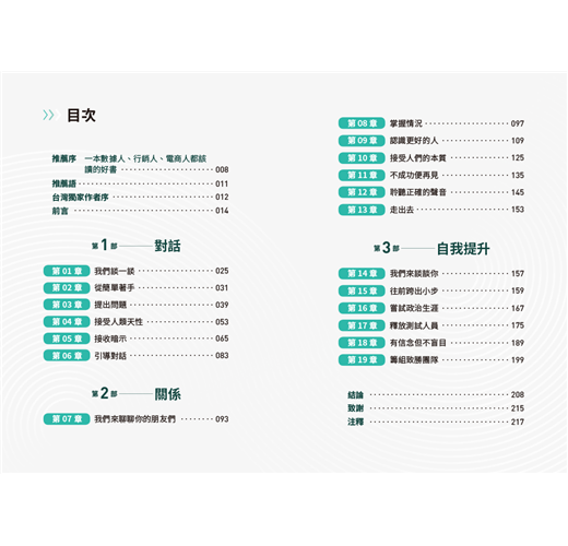 推薦序/一本數據人、行銷人、電商人都該讀的好書 推薦語 台灣獨家作者序 前言 第一部 對話 第01章 我們談一談 第02章 從簡單著手 第03章 提出問題 第04章 接受人類天性 第05章 接收暗示 第06章 引導對話 第二部 關係 第07章 我們來聊聊你的朋友們 第08章 掌握情況 第09章 認識更好的人 第10章 接受人們的本質 第11章 不成功便再見 第12章 聆聽正確的聲音 第13章 走出去 第三部 自我提升 第14章 我們來談談你 第15章 往前跨出小步 第16章 嘗試政治生涯 第17章 釋放測試人員 第18章 有信念但不盲目 第19章 籌組致勝團隊 結論 致謝 注釋