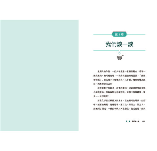 第01章 我們談一談 星期六的午後,一位女子走進一家精品鞋店,看著一雙高跟鞋。無可避免地,一名店員趨前跟她說話。「需要幫忙嗎?」那名女子不理會店員,又多看了幾眼那雙高跟鞋,然後便走出店外。 或許是鞋子的款式、昂貴的價格,或者只是穿起來勢必痛得要命;但無論她有什麼理由,她都不打算購買。還是⋯⋯她想要買? 那名女子當天稍後又回來了,上演相同的場景。打招呼、短暫的興趣、迅速退場。第三次、第四次、第五次,然後到了隔天,一樣的事情又再度發生,後天也是。店員不斷調整他們的策略,這次微笑、下次讚美,任何事情都好...
