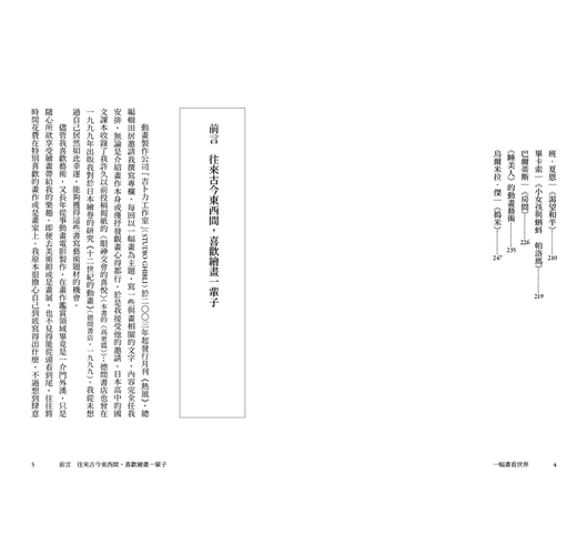本書沒有要打破格式、追溯美術史的意圖,內容也不是為了解開名畫魅力的祕密。整本書不過是一個喜歡繪畫的人交出的「報告」,內容都是個人的探索尋覓,摻雜「私見與偏見」。我在寫作時,本來就沒有特意安排順序,各位閱讀時從喜歡的畫作讀起即可。我的感想常常離題,有時其他話題談得比畫作本身還多,也有發表努力研究的成果,以及抱佛腳的急就章。