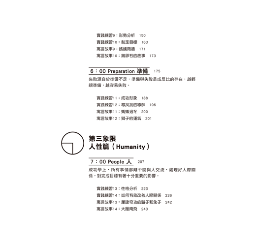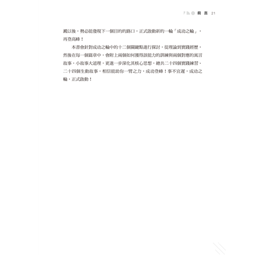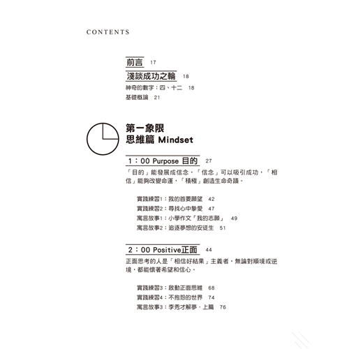 無論你是為了心中的理想、追求、價值等意識形態上的東西,還是為了現實的物質、需求、財富等生活品質上的東西,以「成功之輪」為藍圖,首先要為自己設定一個明確的「目的」,然後透過成功之輪的其他十一章,你將能夠一步步走向「巔峰」。