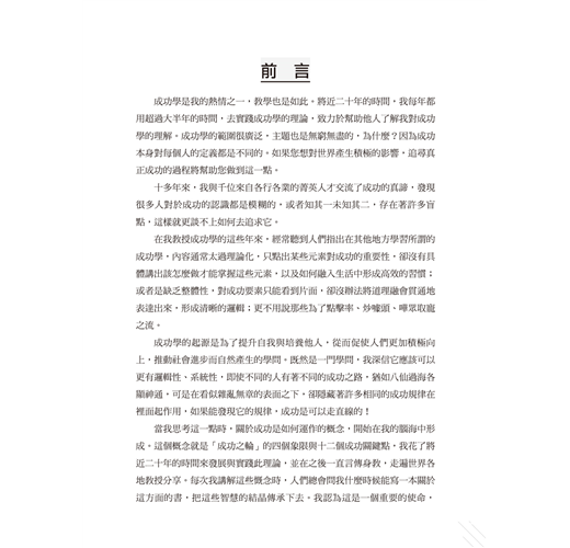 在我教授成功學的這些年來,經常聽到人們指出在其他地方學習所謂的成功學,內容通常太過理論化,只點出某些元素對成功的重要性,卻沒有具體講出該怎麼做才能掌握這些元素,以及如何融入生活中形成高效的習慣;或者是缺乏整體性,對成功要素只能看到片面,卻沒辦法將道理融會貫通地表達出來,形成清晰的邏輯;更不用說那些為了點擊率、炒噱頭、嘩眾取寵之流。