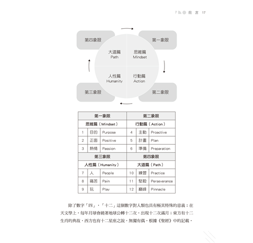 當我思考這一點時,關於成功是如何運作的概念,開始在我的腦海中形成。這個概念就是「成功之輪」的四個象限與十二個成功關鍵點,我花了將近二十年的時間來發展與實踐此理論,並在之後一直言傳身教,走遍世界各地教授分享。每次我講解這些慨念時,人們總會問我什麼時候能寫一本關於這方面的書,把這些智慧的結晶傳承下去。我認為這是一個重要的使命,