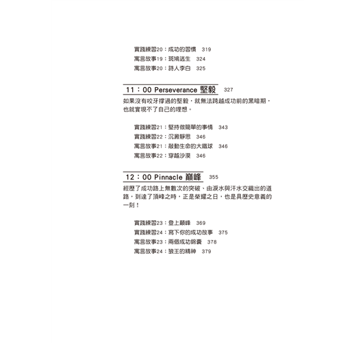 「11點鐘」的Perseverance(堅毅),是將練習中所培養出來的技巧與技能,在實質的行動和心態,磨練得更加爐火純青,進一步將你的能力與心態更腳踏實地、安靜且穩健地提升上。