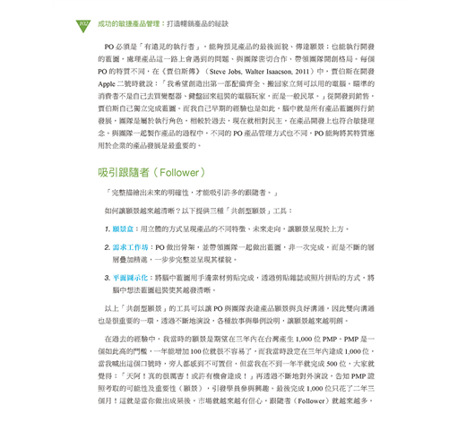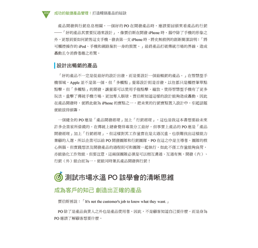 因此,符合台灣產業的PO經典《成功的敏捷產品管理—打造暢銷產品的祕訣》就此誕生,期盼它成為PO界的維基百科,在PO失去方向時,為你指出一條明確的道路。