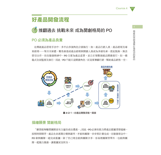 書中彙整高達50篇經典企業成功案例,遍及民生、科技、傳產等多元產業,同時採用「使用者情境導向」的編排方式,深入剖析產品開發到上市的完整流程,並將每一篇精彩內容重點視覺化,以精美圖解說明,無論是菜鳥還是老鳥、或任一工作崗位,在面對不同產業與專案時都能按圖索驥,短時間內融會貫通,是一本相當實用的工具書。