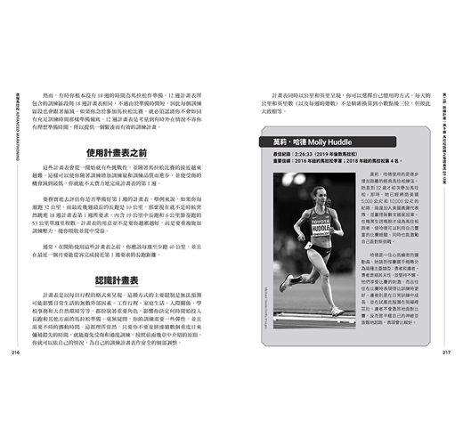 「此書會詳列每日訓練目標,讓你在比賽日擁有充足的體能、恢復與健康,從而獲得絕佳的跑步體驗。」