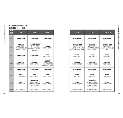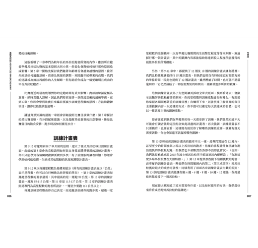 另外,第9-12章中,都提供了12週及18週的訓練計畫表讓你選擇。我們比較推薦讀者採行18週計畫表,但我們也明白有時候並沒有那麼充裕的準備時間,因此也提供了12週計畫表,雖然壓縮了時間,也可能不是最適切的,它仍然涵括了一切在相對短的時間內,要顯著進步所需的鍛鍊。