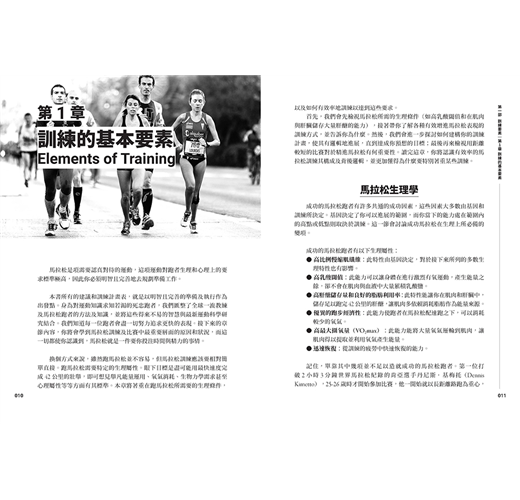 第1章深度探討了在馬拉松上取得成功所需的生理屬性,包括高乳酸閾值、肌肉和肝臟能儲存大量肝醣、善用脂肪作為能量來源、相對高的最大攝氧量和優異的跑步經濟性等等能力。(如果還不清楚以上概念,先別擔心,讀完第1章,你就會完全理解並且知道它們與馬拉松的關係)我們會討論要跑好馬拉松該必備哪些身體特性,接著還會詳細說明要如何訓練,才能提供最大刺激來提升這些特性。