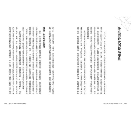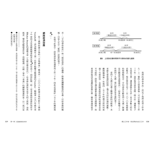 現在也該是時候,顛覆人們對於「職涯」的定義了。人類的預期壽命已上看一百歲,但退休年齡並沒有延後。疫情過後,預計會有大規模的結構調整,再加上人工智能崛起,許多工作將被取代,數位化的千禧世代已悄然來臨。就算運氣好可以工作到五十歲退休,但往後的三十年又該何去何從?而且五十歲正值壯年,不可能不再工作。