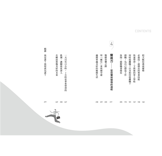 •等待力──等待也是累積、專精和深化的過程,利用〈SPJH座標圖〉找出可以深化的必殺技,以及轉職的策略和時間點,更提出了進一步增加市場區隔性的「雙池策略」。