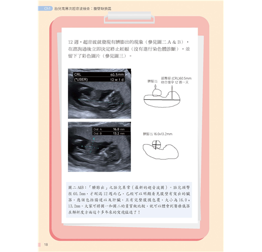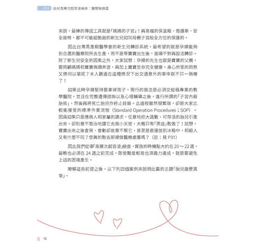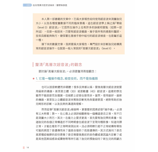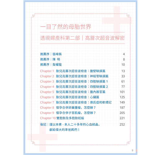 因此,這本書的內容是非常精確而實用的,完全是我本人二十多年來的心血結晶,相信對於想要了解超音波訊息的孕產婦夫妻們,甚至是想要學習產科超音波的醫學生和年輕醫師們,都會有相當的幫助。