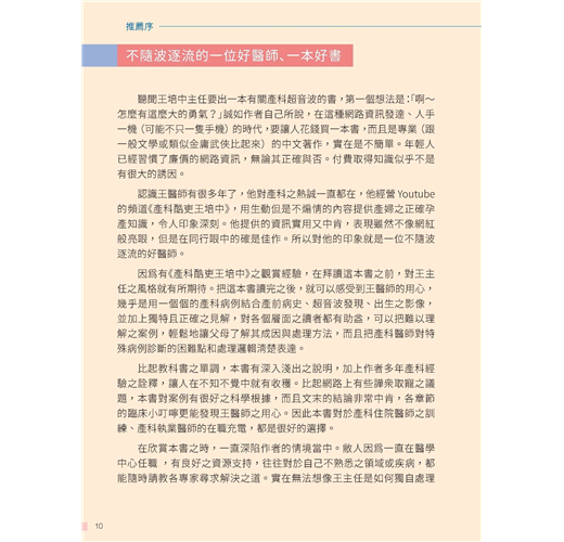 在欣賞本書之時,一直深陷作者的情境當中。敝人因為一直在醫學中心任職 ,有良好之資源支持,往往對於自己不熟悉之領域或疾病,都能隨時請教各專家尋求解決之道。實在無法想像王主任是如何獨自處理這麼多複雜之案例,而且在每一個病例中提出可讓大家學習的地方,實在難能可貴!因為絕大部份之執業產科醫師,很難面面俱到地熟悉每一種特殊或少見之案例的處理流程,因而更突顯出本書之珍貴:可以當作尋求做第一手資料或處理方法的參考。也許讀者無法從本書找到高深的學問,但是本書的案例皆是產科重要的題目,能夠把重要的診斷敘述得深入淺出、容易理解,這正是本書之特點。