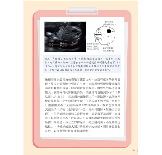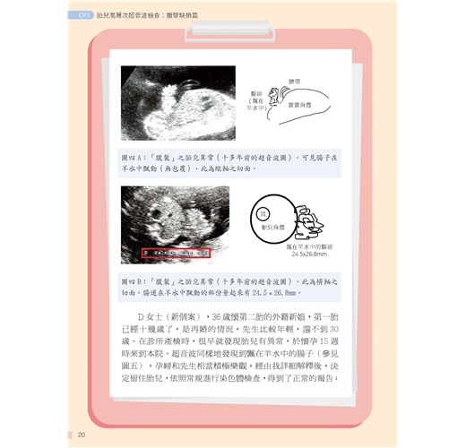 內容包含母胎「高層次超音波」完整的介紹:腹壁缺損、神經管缺損、四肢缺損、腹內器官、心臟、唐氏症的軟標記;加碼演出:懷孕合併卵巢腫瘤或子宮肌瘤、懷雙胞胎及多胞胎,是準爸媽們不可錯過的小百科。