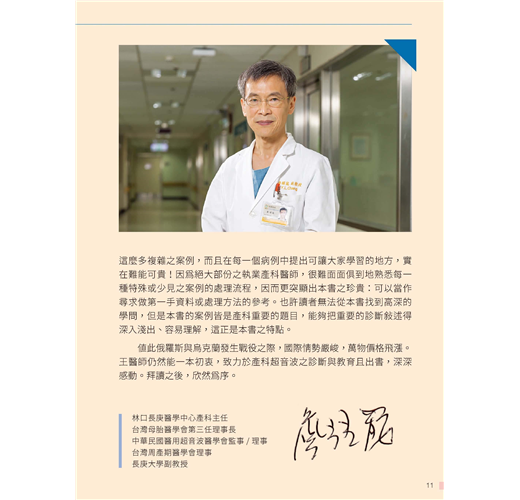 值此俄羅斯與烏克蘭發生戰役之際,國際情勢嚴峻,萬物價格飛漲。王醫師仍然能一本初衷,致力於產科超音波之診斷與教育且出書,深深感動。拜讀之後,欣然為序。