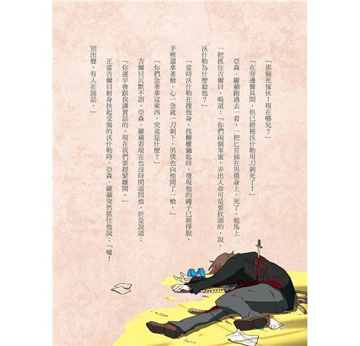 亞森·羅蘋跑過去一看,一把匕首插在男僕身上,死了。他馬上一把抓住吉爾貝,喝道:「你們兩個笨蛋,弄出人命可是要砍頭的,說,沃什勒為什麼殺他?」