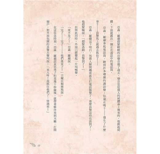 亞森·羅蘋拿起電話筒,聽到許多嘈雜的講話聲:你還在嗎?……發生了什麼事?……員警馬上就過去救你了……