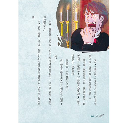 這時,吉爾貝說:「德布萊克把所有的傢俱都放在二樓,我們從簾子後面的樓梯上去吧!」
