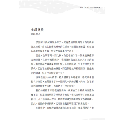 在過去的六年中,感恩希塔療癒、阿卡西紀錄及家庭系統排列,我漸漸把自己的頻率提升到一個較高的維度,以前看不懂的《金剛經》及《心經》,如今已豁然貫通,同時也學習到許多量子物理學理論對於靈性世界的解釋。每一天,我都感覺到自己的能量在迅速提升,同時也成為了國際認證的阿卡西紀錄國際中文導師及高級希塔療癒師。