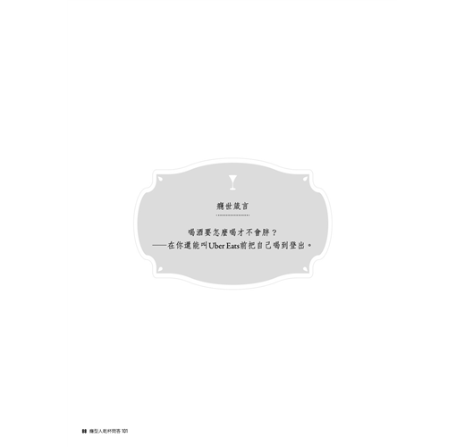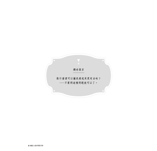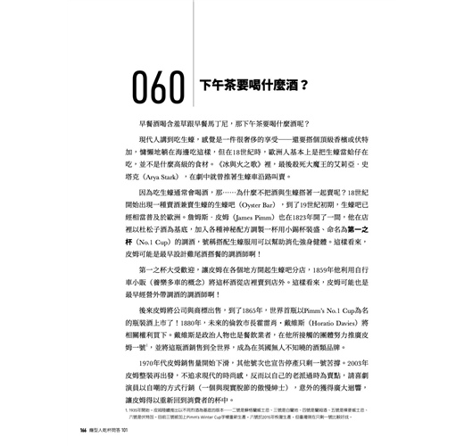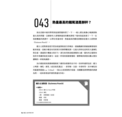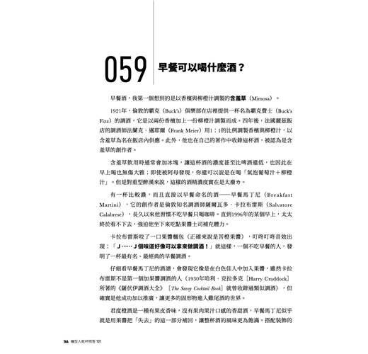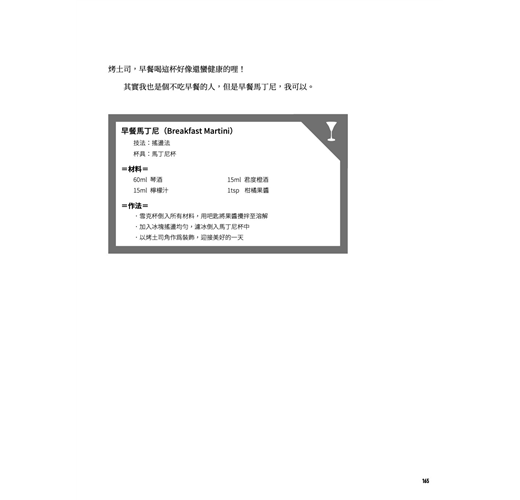 這是一本知識與故事兼具的調酒參考書,癮型人以做研究的態度,發掘出每一杯酒背後的佚事趣聞,再用好笑筆觸呈現,十足令人發噱噴飯。