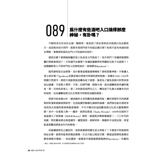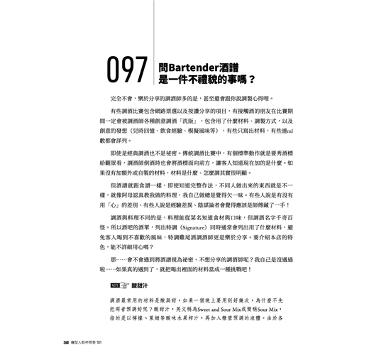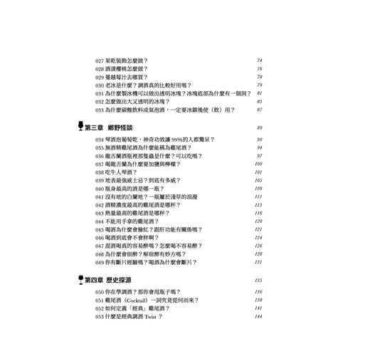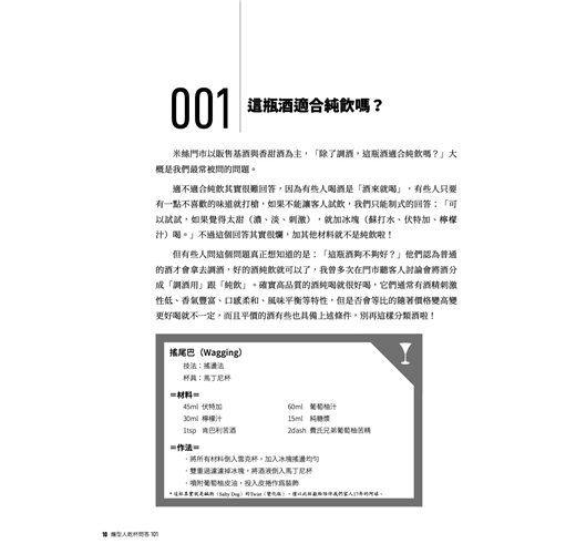 如何跟Bartender互動才不會失禮講錯話?酒吧「靠北客人」熱門榜,亂碰東西、不懂裝懂、指揮調酒師做不知所云的加工、無故討酒喝……你是哪一種?「調酒乙級學科」考古題答案超瞎,酒單設計原來要優先考慮「名符其實、物有所值」?調酒師從雪克杯倒酒,最後甩的那一下絕對不是耍帥?酒吧入口昏暗神秘,原來是美國禁酒令的歷史共業?酒單沒有的酒可以點,酒譜材料也可以問?