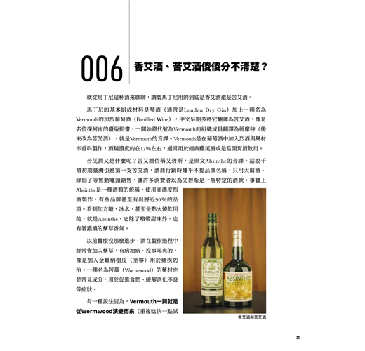 苦艾酒與香艾酒的「黃金交叉」,竟是摒棄醫療用途、為求風味和諧的結果?大名鼎鼎的干邑白蘭地,在臺灣因進口量不同,陳年較久的款還比較便宜?價差從兩百多到上千都有的伏特加,其實內含物主要是「水+乙醇(酒精)」?香甜酒的味道很假,但太真實的味道其實弱到難以想像?