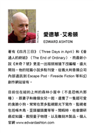 目前住在紐約上州的森林小屋中(不是恐怖片那種),跟妻子還有幾個女兒一起,還養了一隻超可愛的臭臉小狗。常常在眾多監視眼光下寫作,監視者包括啄木鳥、歪頭貓頭鷹等等。閒暇時,他會鑽研癌症知識,教授量子物理,以及雕刻木製品。個人官網www.edwardashton.com