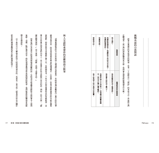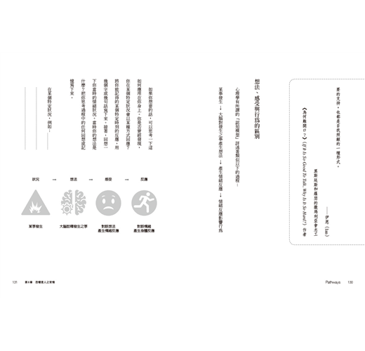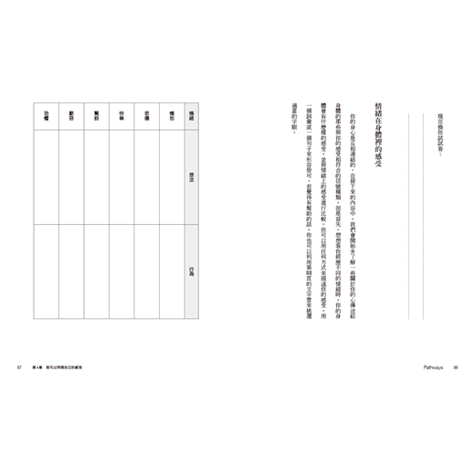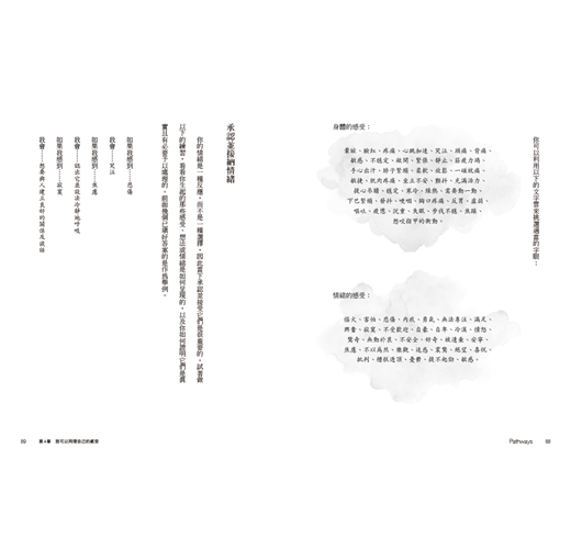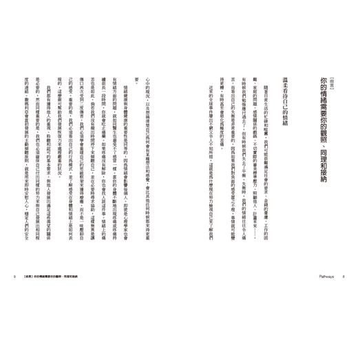 或許這與經常是出於某種善意的社會制約有關。想像一下對孩子說「不要哭」或「別那麼生氣嘛」的父母或老師。他們之所以說這些話,是因為他們不想看見極度苦痛的孩子,這會令人煩惱;反之,他們比較想看見孩子有更和諧或更正向的感受。但隨著時間過去,這反而教導了我們,我們不該有負面的情緒,於是乎我們學會潛抑這些情緒。可是經歷人生的難關而沒有出口,會導致我們的情緒健康失去平衡。因此,本書將檢視那些能讓你重新與自己建立良好關係的方法,並以安全的方式對這些想法和感受進行探討。
