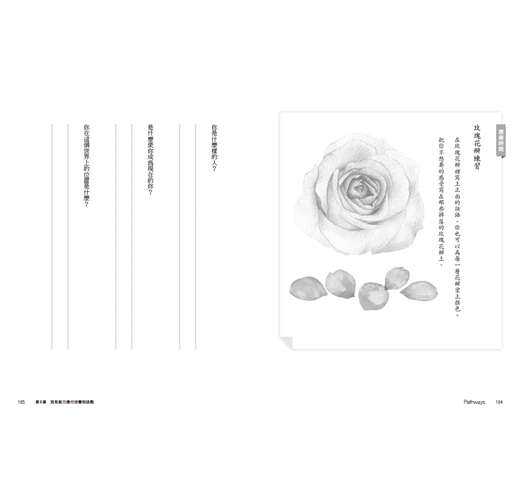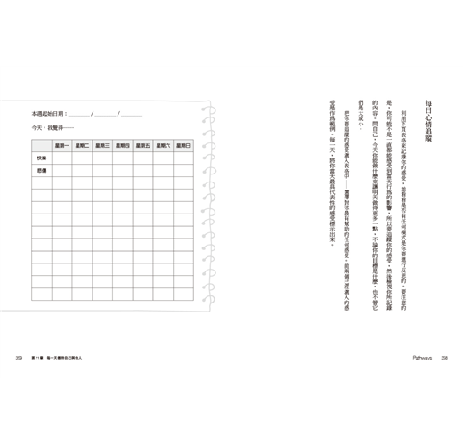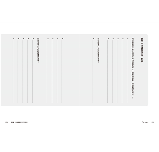 我們傾聽別人說話就是提供對方安全的處所,好讓他們能自行釐清眼前的狀況,以及他們想要如何處理它。同樣的,這本書中的空白處也提供你中立的空間,使你能不帶任何論斷地探索任何你想探討之事。我們或許會提供一、兩個建議來鼓勵你,並幫助你詳細說明或釐清問題,然而這畢竟是你的日記,是你自己要走的旅程。