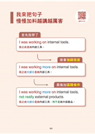 這兩年我在臉書粉專「Cathy Girl 凱茜女孩」寫了一兩百篇文章,做了幾百張圖卡,用了各式各樣真實的例子(像是科技公司及外商公司員工、美國創業家、商學院教授說的英文,及《經濟學人》文章……),教大家怎麼模仿別人的英文,並套用到自己的情境裡。我同時也分享了很多更容易學習英文的方法,像是要站在已經會的基礎句型上再慢慢加東西上去,才能越講越複雜;如何善用基本單字把它發揮到最大;如何利用大腦記憶的特性,讓英文不會學了就忘;還有如何切換中文跟英文的邏輯……等,這些方法背後都有強大的學習理論支撐。