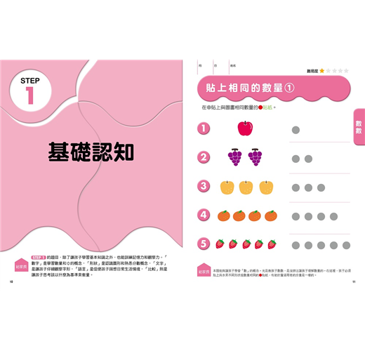 第一階段為「基礎認知」,以數字、形狀、文字、語言和比較為主題,了解數量、分數和0的概念,辨認圖形和字形,以及憑直覺區分事物的長短、大小或粗細。除了學習基本的知識,也能訓練記憶力和觀察力。