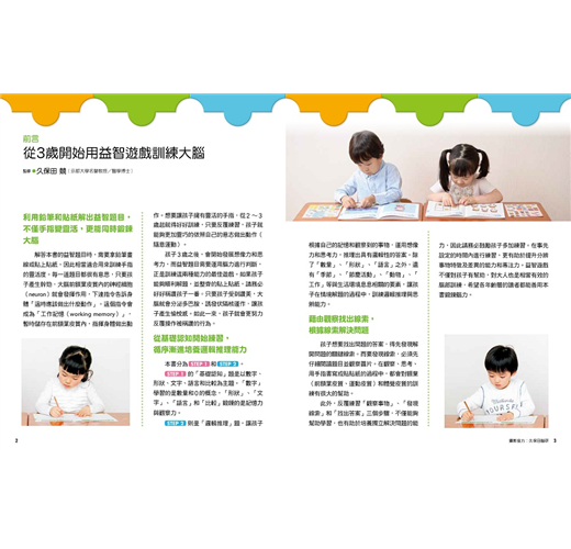 臨床上,我經常建議家長多陪伴孩子玩「需要動腦」的益智遊戲,因為現今的孩子普遍在基礎認知能力的扎根是足夠的,卻無法在日常生活中靈活運用所學,進而影響解決問題的能力與創造力的發展。在此推薦父母帶著孩子閱讀日本育腦專家久保田競博士的最新著作《日本腦科學權威久保田競專為幼兒設計有效鍛鍊大腦益智遊戲100題》,透過每日持之以恆的練習,訓練觀察力、記憶力、想像力和邏輯推理能力,讓孩子的大腦不僅是存放知識的倉庫,而是能夠將其活用自如的超級電腦!