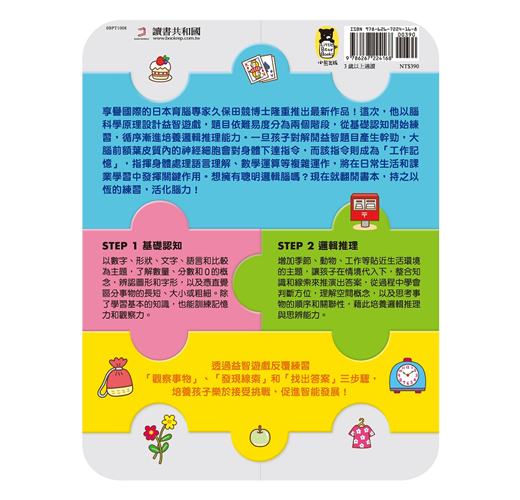 一旦孩子對解開益智題目產生幹勁,大腦前額葉皮質內的神經細胞會對身體下達指令,而該指令則成為「工作記憶」,指揮身體處理語言理解、數學運算等複雜運作,將在日常生活和課業學習中發揮關鍵作用。想擁有聰明邏輯腦嗎?現在就翻開書本,持之以恆的練習,活化腦力!