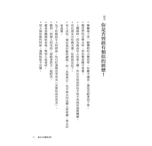 因此本書提出了各種工具和方法,使我們掙脫從小到大的枷鎖,讓我們肯定:自己的想要和需要,至少與其他人的,具有同等的重要性。