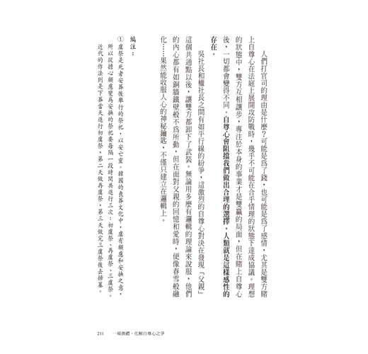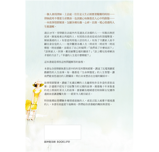 本書包含曺律師執業生涯中的所見所聞和經歷,講述了比電視劇更戲劇性的人生故事,每一篇都是「生命與態度」的人生智慧,讓我們能省思過往的人際關係,明白未來想活在怎樣的關係中。