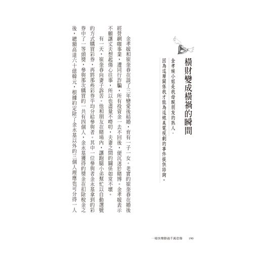 過去25年,曺律師在法庭內外見過各式各樣的人──有脫出挫折的泥淖、帥氣地東山再起的人;有因為自負而從成功的頂端墜落、傾家蕩產的人;有惡意利用他人信任的人;有為了守護家人而不顧自身安危的人……他旁觀著各種人生,時而笑、時而哭、時而憤怒、時而感動,並提出了自己的疑問:「我們為了什麼而活?」「該與家人、同事、鄰居維繫怎樣的關係?」「該上哪兒找尋解決矛盾的方法?」「幸運的人生是什麼模樣?」
