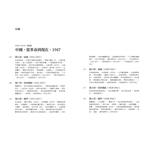 革命與教會……從風和日麗到狂風暴雨……朝獨立邁進一步……汕頭的重大損失……第二代宣教師……世界大戰的影響……中國基督教青年會……中華續行委辦會……潮州府的改變與機會……汕頭內戰,1917年……汕頭地震,1918年……汲約翰博士逝世……汕頭的另一場大難,1922年……汕頭醫院……醫療損失……戰後運動……汕頭罷工……汕尾的艱辛與磨難……中國南方的基督少年軍……婦女事工……男學生與愛國主義……二次革命,1926-1928年……汕頭宣教同工(1911-1927)……潮州府宣教同工(1911-1927)……汕尾宣教同工(1911-1927)