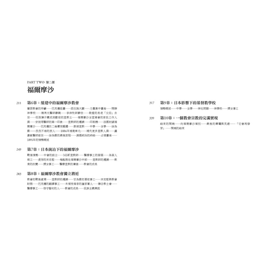 美麗島……荷蘭占領時期……我們首位前往福爾摩沙的宣教師……遭逐出臺南……初熟之果──4位受洗者……李庥抵台……多事之年……樟腦之亂……開拓平埔番(Pepo-hoan)之宣教……一名誠摯的真理追尋者……派任德馬太醫師……一位秀才的證詞……一名瘸腳剃頭師傅的見證……拜訪熟番(Sek-hoan)……馬雅各返鄉……甘為霖抵台……「生番」……加拿大長老教會差會……教會境況……1874年進駐嘉義……甘為霖死裡逃生……回顧……總結