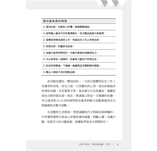 【國際檢測表格】書中集結的表格能進一步評估自己的心理、生理狀況,是否已達臨界點,建立一套專屬於你的照護系統。