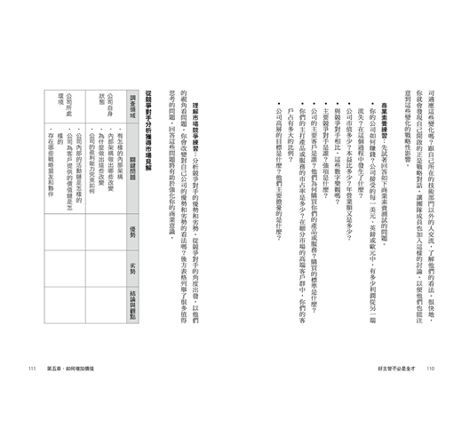 不管你是E型領導者或S型領導者,書裡面的架構都是依照這三個基本面向展開,分別列出E型和S型領導者,在每一個面向,各自該具備哪五項能力,並且提出了相應的練習課題。