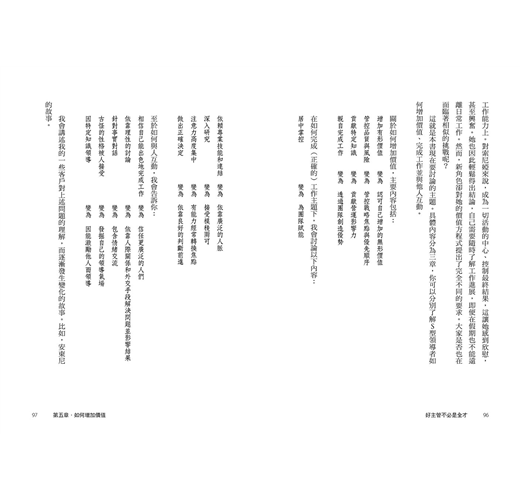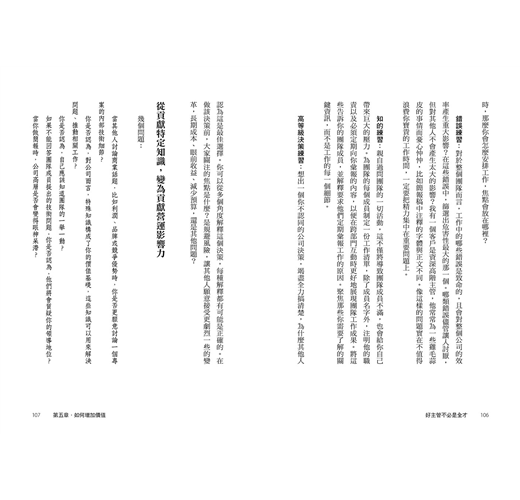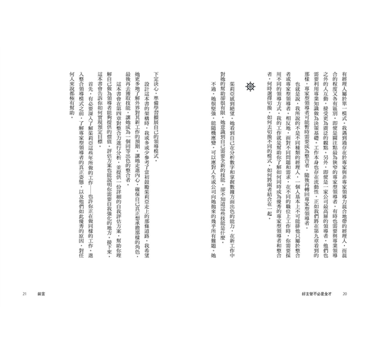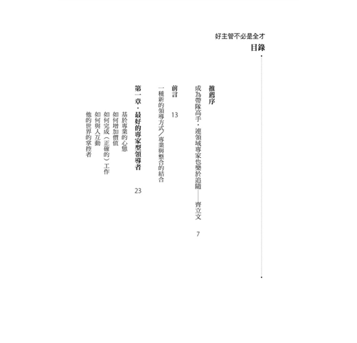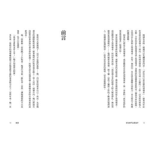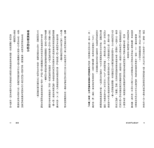 要是你想要接受新的挑戰,那麼本書的其餘章節,都是在傳授如何從E型領導者,成功轉型為S型領導者。如同作者所說,「我見過太多的經理人陷入極度掙扎,無法突破專家型領導模式。⋯⋯他們被要求領導一群下屬,這些下屬對工作的了解遠比他們深入,知識遠比他們豐富。」如果這也是你的處境,這本書推薦給你。