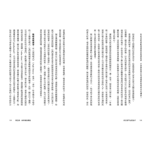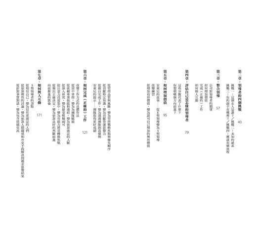 閱讀本書時,建議可以先翻到第四章,「評估自己是怎樣的領導者」,接著再牢記作者提出的領導力三面向:如何增加價值、如何完成(正確的)工作,以及如何與他人互動。