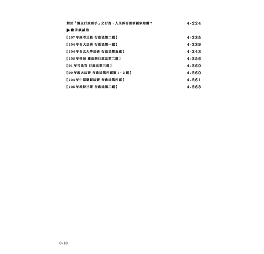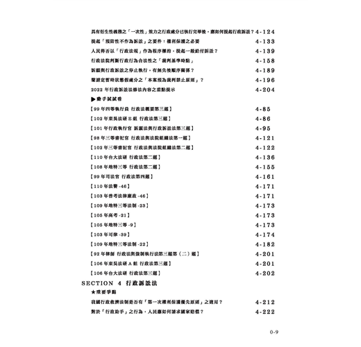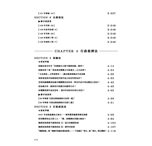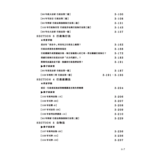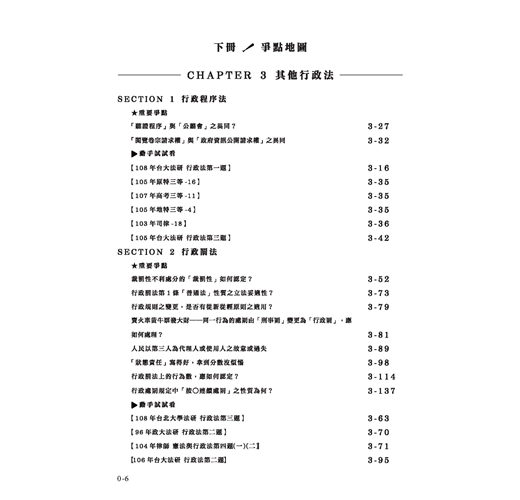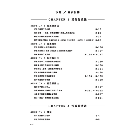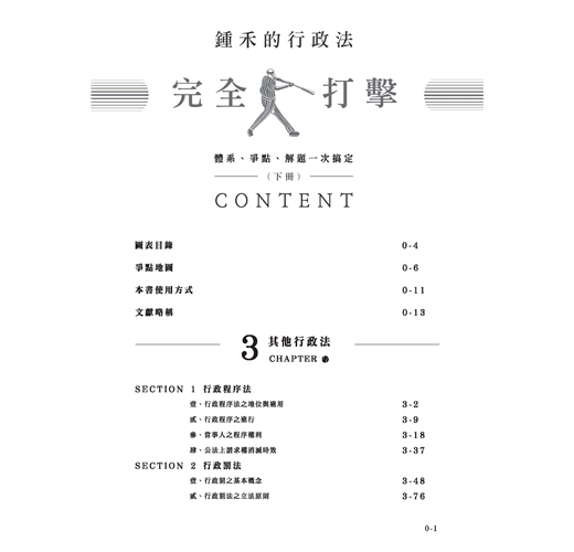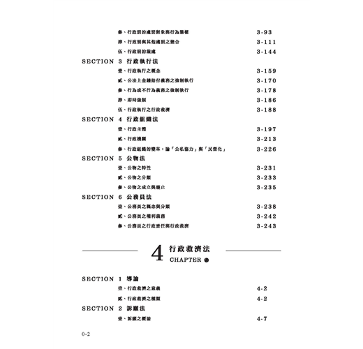 本冊為下冊,於第三章其他行政法,第一節行政程序法介紹行政程序法之地位與適用、行政程序之開始至終結、正當行政程序內涵、當事人之程序權利(迴避、片面接觸之禁止、受告知權、聽證程序、陳述意見、閱覽卷宗請求權)、公法上請求權消滅時效等;第二節行政罰法詳細介紹行政罰,包含立法原則、行為責任與狀態責任、第15條併同處罰規定、行政罰與其他處罰之競合、行為數之認定(釋字第604號解釋、原最高行政法院98年11月份第2次決議、原最高行政法院105年10月份決議、釋字第754號解釋)、按日連續處罰之正當程序、裁處權時效之起算點、裁處之酌減及擴張、便宜原則、追繳不法利得、沒入、管轄機關、裁處程序、保全程序與救濟;第三節行政執行法詳細介紹行政執行,其開始與終止、程序與方法、職務協助、公法上金錢給付義務、釋字第621號解釋、拘提、管收、禁止命令、行為或不行為義務之強制執行、代履行、怠金、即時強制、聲明異議、債務人異議之訴等;第四節行政組織法則涉及管轄、行政法人、部落公法人、公權力委託、獨立機關、公私協力、民營化等重點;第五節公物法介紹公物之特性、分類、成立與廢止;第六節公務員法介紹公務員之分類及權利義務、行政責任與行政救濟。