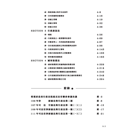 書籍上冊包含「第一章:行政法總論」、「第二章:行政作用法」兩大章,下冊包含「第三章:其他行政法」、「第四章:行政救濟法」兩大章。