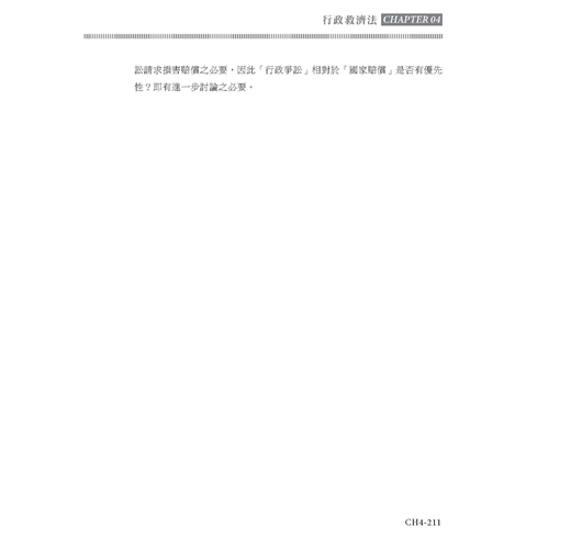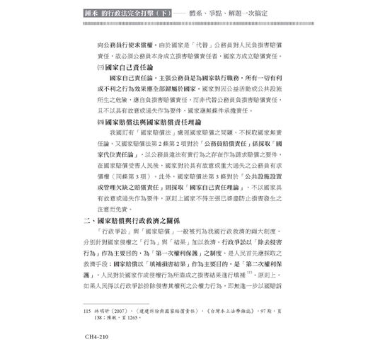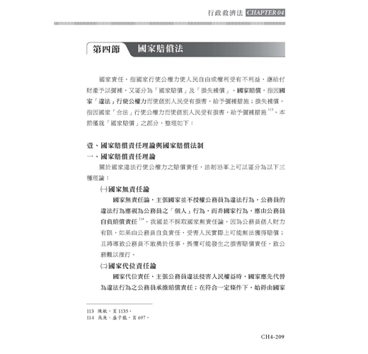 在第四章行政救濟法,第一節導論介紹行政救濟之意義及種類;於第二節訴願法,介紹提起訴願之合法要件、當事人適格、共同訴願、訴願參加、訴願管轄機關、審理程序、程序終結、訴願決定之效力、救濟、再審、訴願法第81條第1項但書之不利益變更禁止原則、第82條第2項遲到處分、第83條之情況決定;第三節行政訴訟法詳細介紹行政訴訟,包含一般及各訴訟類型(撤銷訴訟、課予義務訴訟、確認訴訟、一般給付訴訟)為實體判決之要件、多數當事人之情形、孤立的撤銷訴訟、競爭者訴訟、爭訟方式之選擇、預防性不作為訴訟、訴訟程序之進行、作成裁判、確定判決之效力、裁判基準時點、行政訴訟之強制執行、救濟途徑、和解、其他行政訴訟程序之重點整理,包含通常訴訟程序及簡易訴訟程序、上訴、抗告、再審與重新審理程序、交通裁決、收容聲請與都市計畫審查程序、暫時權利保護制度(停止執行、假扣押、假處分)、本案預為裁判禁止原則,以及2022年行政訴訟法修法內容之重點提示;第四節國家賠償法,介紹國家賠償責任類型與國家賠償法制、「第一次權利保護優先原則」之適用與否、國家賠償請求權之行使、賠償方法與範圍。