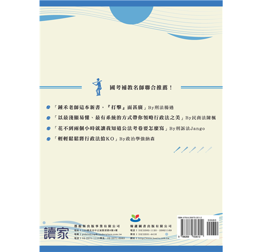 《鍾禾的行政法完全打擊:體系、爭點、解題一次搞定》共分上、下兩冊,是行政法考科簡明白話且全面的閱讀教材,也是實務工作者釐清行政法重要爭點與法院見解適用的工具書。同時為顧及國家考試、法律系研究所之應考需求,本書在爭點及學說實務之演變上多有著墨、筆法俐落完整。作者鍾禾老師(莊智翔律師)為國立臺北大學法律學系學士、國立臺灣大學法律學系公法組碩士、107年律師高考選試勞動社會法組第二名,於知名司法考試及公職補習班授課資歷三年,主要講授憲法及行政法。