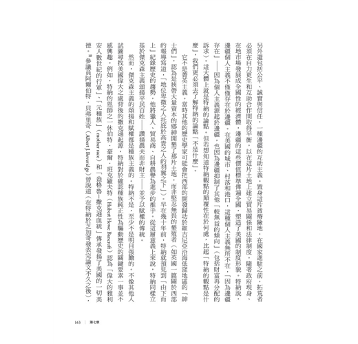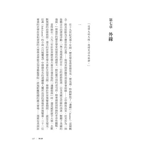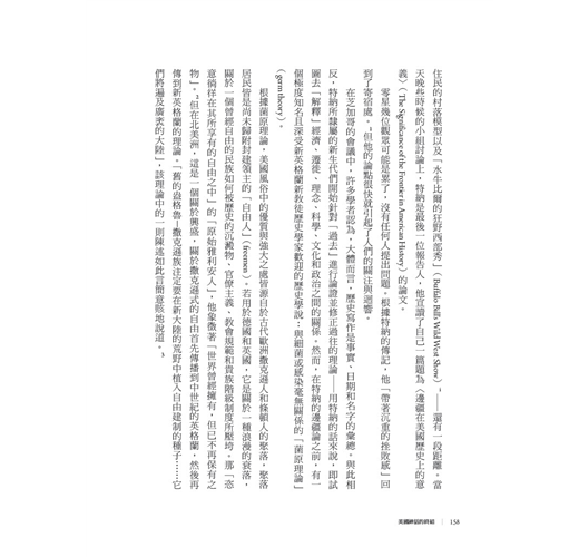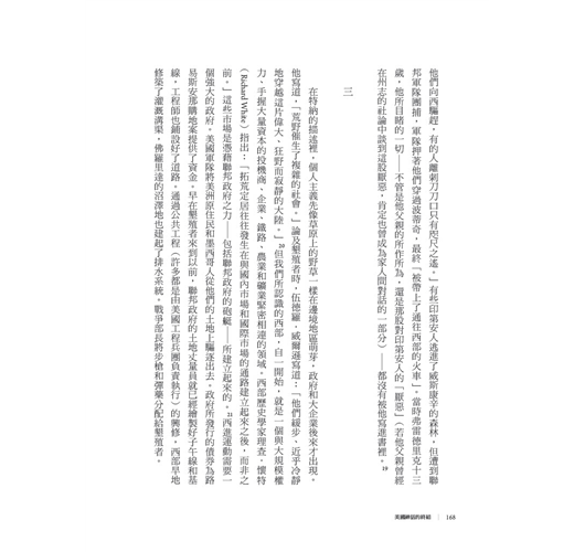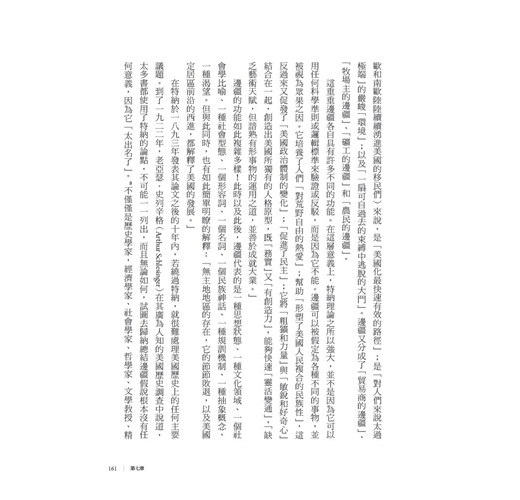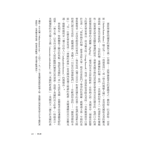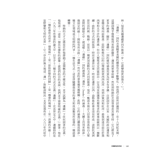 邊疆的語言如詩,而歷史學家弗雷德里克.傑克遜.特納(Frederick Jackson Turner)則是最偉大的桂冠詩人之一。他在一八九三年寫道:「美國就像是社會歷史上的一大頁。」「當我們由西部至東部逐行閱讀這個大陸時,我們會發現社會進化的紀錄。」特納說,發生在北美大陸的擴張使歐洲人成為新的民族──既粗獷又充滿好奇心,既自律又躁動,既務實又創新,充滿「焦躁、緊張的能量」,並且受到「伴隨自由而來的活力與蓬勃發展」所鼓舞。特納的學術生涯從十九世紀後期橫跨至二十世紀初期,當時的種族歧視正值巔峰,禁止異族通...