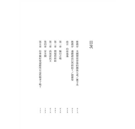 這種觀點——在美國漫長的歷史中,無止無盡的擴張(不管是領土擴張還是憑藉著市場和軍國主義進行擴張)轉移了國內的極端主義——還有許多值得探索之處。例如,歷史性的創傷、怨憤、神話和象徵如何世代相傳?就當時的客觀情況來說,美國是否需要進行擴張以確保國外資源,並為國內產業開闢新市場?還是,這個國家的領導人就是堅信他們必須擴張?無論這些問題的答案為何,不爭的事實是,美國自建國以來就不斷向外推進,並以道德語言——認為擴張對於邊疆內外的人民皆大有裨益——合理化這種擴張行徑。歷史學家威廉.艾普曼.威廉斯(William Appleman Williams)在一九六六年寫道,擴張的概念「從心理學和哲學的角度來說是十分令人振奮的」,因為它能夠「無限延伸」。(未完)